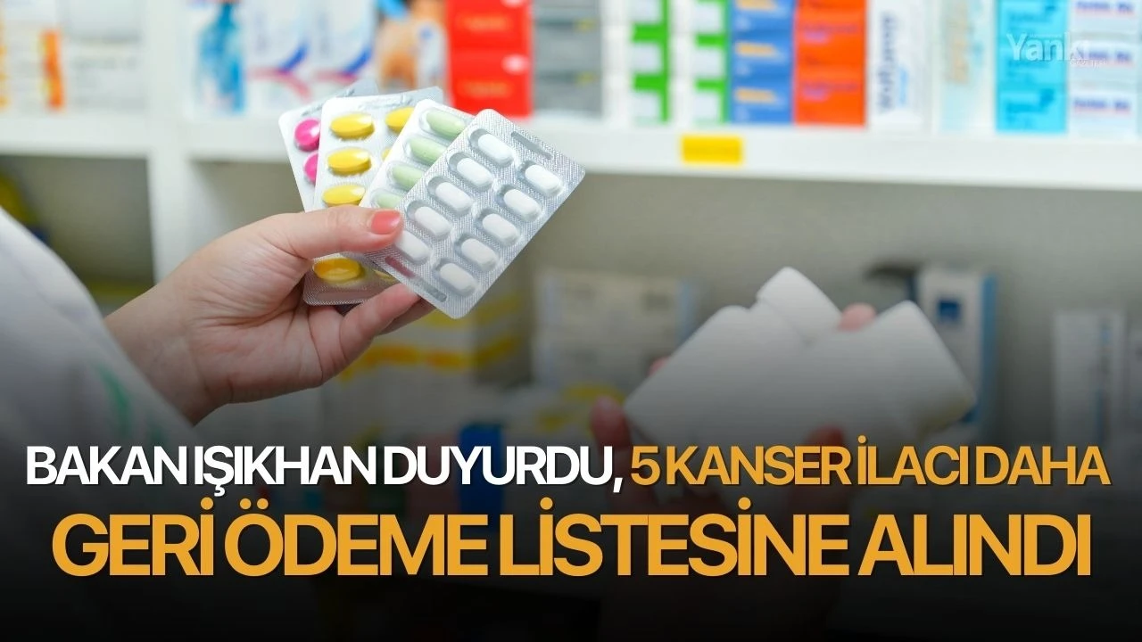 Bakan Işıkhan, sosyal medya hesabından yaptığı paylaşımda, "Sosyal Güvenlik Kurumumuzun düzenlemesiyle 5 kanser ilacını daha geri ödeme listesine aldık. İlaçların hastalarımıza şifa olmasını temenni eder, vatandaşlarımıza sağlıklı bir ömür dilerim" ifadelerini kullandı.