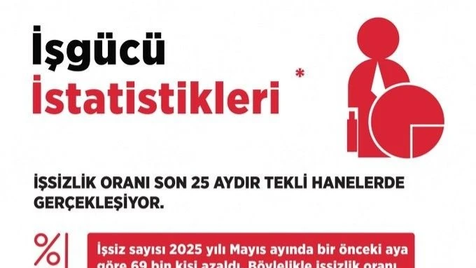 Çalışma ve Sosyal Güvenlik Bakanı Vedat Işıkhan, Türkiye İstatistik Kurumu’nun (TÜİK) mayıs ayı dış ticaret ve işgücü istatistikleri ile hizmet üretici fiyat endeksini açıklamasının ardından sosyal medya hesabından açıklamada bulundu. Yatırım, istihdam, üretim ve ihracat odaklı büyüme stratejilerinin işgücü verilerinde olumlu seyri devam ettirdiğini belirten Işıkhan, "Son 25 aydır tekli hanelerde gerçekleşen işsizlik oranı, bu yılın mayıs ayında bir önceki aya göre 0,2 puan azalarak yüzde 8,4 seviyesinde gerçekleşti. 69 bin kişi azalan işsiz sayısı, 2 milyon 972 bin kişiye geriledi. Genç nüfusta da azalan işsizlik oranı, aynı dönemde 0,3 puan gerileyerek yüzde 15,4 oldu" ifadelerine yer verdi.