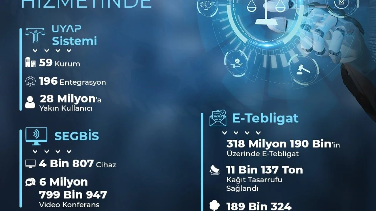 "Kendi kaynaklarımızla, yerli ve milli imkanlarımızla hayata geçirdiğimiz proje ve uygulamalarla zaman ve mekan sınırlarını ortadan kaldırıyoruz. Böylece işlemleri daha da hızlandırırken kaynaklardan ve masraflardan sağladığımız tasarrufla ülke ekonomisine katkıda bulunuyoruz. Dünyaya örnek olan ve 24’ü uluslararası olmak üzere toplam 47 ödüle layık görülen Ulusal Yargı Ağı Projesi (UYAP) ile yargı hizmetlerini teknolojik gelişmelerle güçlendirdik ve bilişim alanında tarihi bir dönüşüme imza attık. UYAP sistemini hayata geçirdiğimiz 2007 yılından günümüze kadar toplam 59 kurum ve kuruluş ile 196 entegrasyon gerçekleştirdik. Bilgi ve belgelerin saniyeler içerisinde temin edilebildiği UYAP’ta; vatandaş portalı 24,6 milyon, avukat portalı 209 bin, uzlaştırmacı portalı 19 bin, bilirkişi portalı 83 bin, arabulucu portalı 48 bin, e-satış portalı 3 milyon kullanıcıya ulaştı. Uygulamaya koyduğumuz Sesli ve Görüntülü Bilişim Sistemleri (SEGBİS), tutuklu ile hükümlülerin duruşma salonlarına getirilmesinin, vatandaşlarımızın ifade vermek için uzaktaki mahkemeye gitmesinin önüne geçtik. SEGBİS’in kullanılmaya başlanıldığı 2013 yılından bugüne kadar kurulumunu tamamladığımız 4 bin 807 adet cihaz ile 6 milyon 799 bin 947 video konferans görüşmesi yapılmasını sağladık. Hukuk mahkemesi yargılamalarında tarafların ve avukatların mahkeme salonuna gitmeden çevrimiçi katıldığı e-duruşma sistemiyle ise 15 Eylül 2020 tarihinden itibaren 3 milyon 705 bin 97 duruşma gerçekleştirdik. E-tebligat sistemiyle haftalarca süren tebligat işlemini, saniyeler içerisinde gerçekleştirilebilir hale getirdik. Böyle yargı süreçlerini hızlandırırken doğamızın yok olmasının önüne geçtik. 2015 yılından günümüze 318 milyon 190 binin üzerinde e-tebligat göndererek; 11 bin 137 ton kağıt tasarrufu sağladık, 189 bin 324 ağacı kesilmekten kurtardık, 24 milyar 358 milyon 333 bin lira tasarruf ettik."