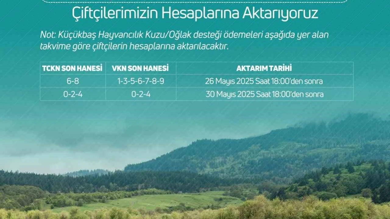 ’Küçükbaş hayvancılık kuzu/oğlak desteği’ ödemeleri çiftçilerin hesaplarına, kimlik kartlarının son hanesi 6-8, VKN son hanesi 1-3-5-6-7-8-9 olanların 26 Mayıs saat 18.00’den itibaren aktarılacağı, kimlik kartlarının son hanesi 0-2-4, VKN son hanesi 0-2-4 olanların ise 30 Mayıs saat 18.00’den itibaren aktarılacağı bildirildi.