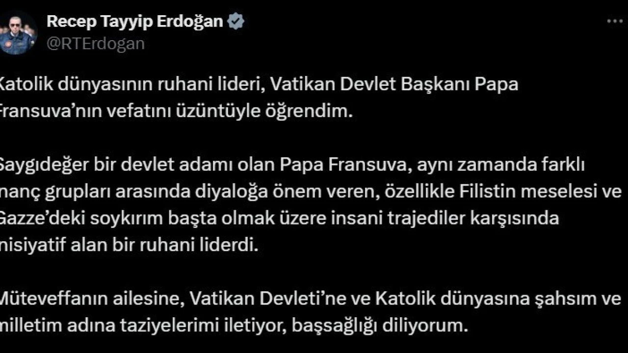"Katolik dünyasının ruhani lideri, Vatikan Devlet Başkanı Papa Fransuva’nın vefatını üzüntüyle öğrendim. Saygıdeğer bir devlet adamı olan Papa Fransuva, aynı zamanda farklı inanç grupları arasında diyaloğa önem veren, özellikle Filistin meselesi ve Gazze’deki soykırım başta olmak üzere insani trajediler karşısında inisiyatif alan bir ruhani liderdi. Müteveffanın ailesine, Vatikan Devleti’ne ve Katolik dünyasına şahsım ve milletim adına taziyelerimi iletiyor, başsağlığı diliyorum."