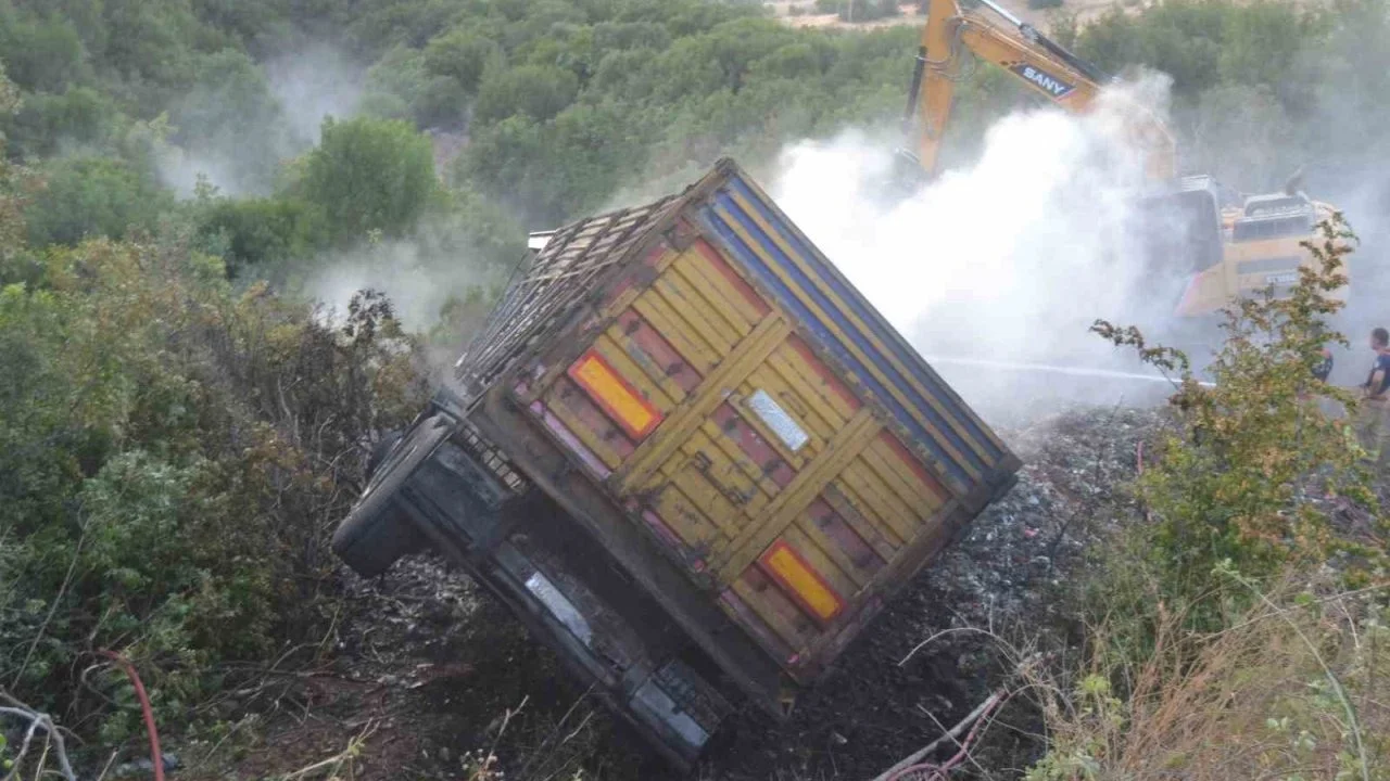 Manisa’nın Salihli ilçesinde virajı alamayarak şarampole devrilen kamyon alev alev yandı. Yangın ormana sıçramadan söndürüldü.