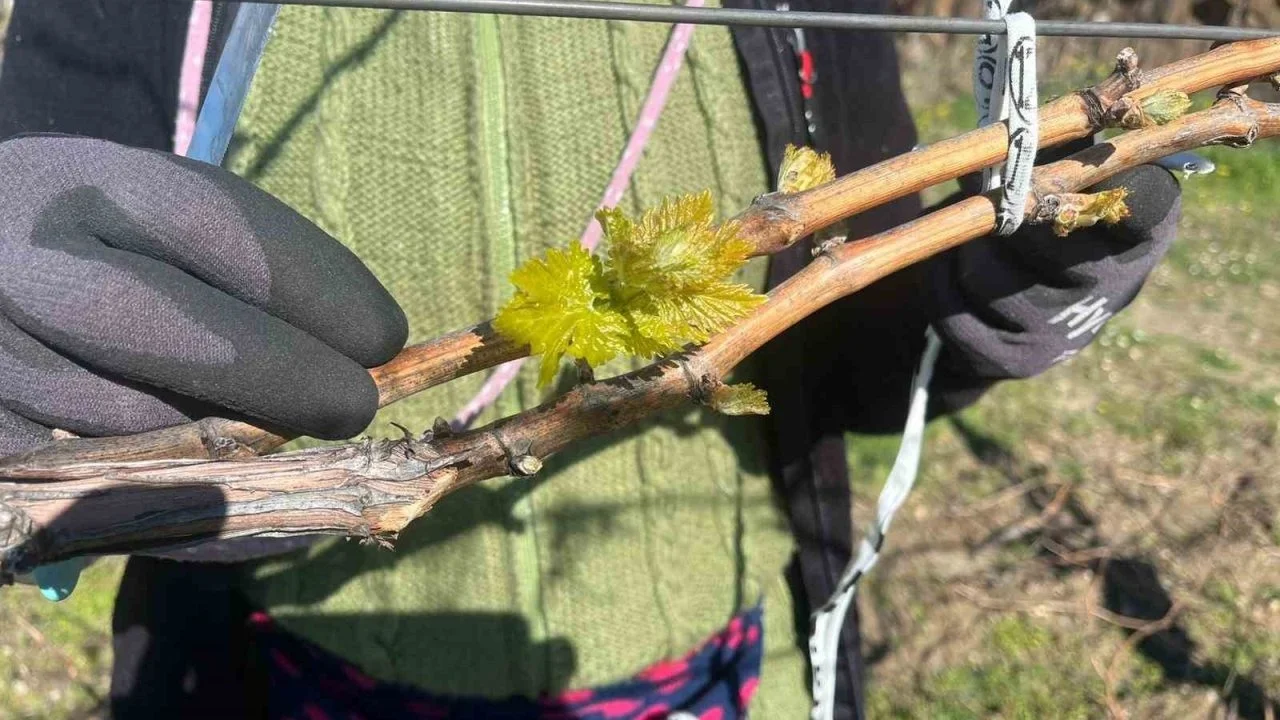 Sarıgöl’ün Tırazlar Mahallesi’nde 25 dekarlık erkenci Süperyol üzüm bağı bulunan üretici Aytaç Ünlükoç, çubuk bağlama çalışması yaptığı sırada bağ çubuklarındaki gözlerin patladığını ve yaprakların belirgin şekilde ortaya çıktığını fark etti.