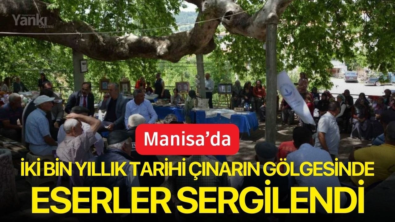 Manisa’nın Demirci ilçesinde halk eğitim merkezi kursiyerlerinin yıl boyunca hazırladığı el emeği ürünler, 2 bin yıllık tarihi çınarın gölgesinde sergilendi.