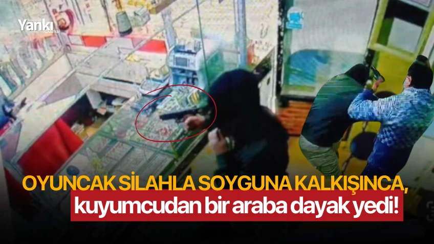 Bursa’nın Osmangazi ilçesi Gülbahçe Mahallesinde kuyumculuk yapan Tamer Ekim (49), dükkanda oturduğu esnada içeri giren kar maskeli bir kişi tarafından kendisine silah doğrultuldu. Panikleyen kuyumcu, saldırganın uzattığı çantaya altınlara doldurmaya başladı. Kuyumcu tezgahının arkasına doğru yaklaşan saldırganın elindeki silahın oyuncak olduğu anlayan dükkan sahibi Ekim, çantayı bırakıp saldırganın elindeki oyuncak tabancayı alıp soyguncuyu vurmaya başladı. Panikleyen şüpheli hemen kapıya doğrulup hızla kayıplara karışırken, trajikomik anlar iş yerinin kamerasına anbean yansıdı.