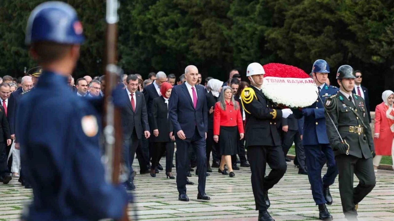TBMM Başkanı Numan Kurtulmuş başkanlığında devlet erkanlarından oluşan heyet, Aslanlı Yol’dan yürüyerek Mustafa Kemal Atatürk’ün mozolesine geldi. Kurtulmuş’un mozoleye çelenk bırakmasının ardından saygı duruşunda bulunuldu ve İstiklal Marşı okundu. Daha sonra Misak-ı Milli Kulesi’ne geçen Kurtulmuş, Anıtkabir Özel Defteri’ne şunları yazdı: