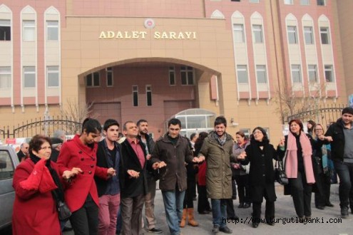 Duruşma başlamadan önce, Manisa Emek ve Demokrasi Platformu'na üye çeşitli sivil toplum örgütlerinden ve odalardan yaklaşık 100 kişi Adliye Sarayı'nın önüne geldi. Grup 'AK Parti'ye teslim olmayacağız', 'Her yer Gezi her yer direniş', 'Bu daha başlangıç, mücadeleye devam' sloganları attı, şarkılar eşliğinde halay çekti. Grup Adliye Sarayı'nın önüne Gezi Parkı direnişlerini sembolize eden çeşitli karikatürler bıraktı.
