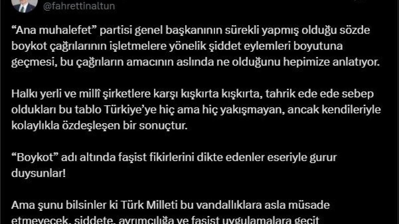 İletişim Başkanı Fahrettin Altun sosyal medya hesabından yaptığı paylaşımda, "‘Ana muhalefet’ partisi genel başkanının sürekli yapmış olduğu sözde boykot çağrılarının işletmelere yönelik şiddet eylemleri boyutuna geçmesi, bu çağrıların amacının aslında ne olduğunu hepimize anlatıyor. Halkı yerli ve milli şirketlere karşı kışkırta kışkırta, tahrik ede ede sebep oldukları bu tablo Türkiye’ye hiç ama hiç yakışmayan, ancak kendileriyle kolaylıkla özdeşleşen bir sonuçtur. ‘Boykot’ adı altında faşist fikirlerini dikte edenler eseriyle gurur duysunlar! Ama şunu bilsinler ki Türk milleti bu vandallıklara asla müsaade etmeyecek, şiddete, ayrımcılığa ve faşist uygulamalara geçit vermeyecektir" ifadelerine yer verdi.