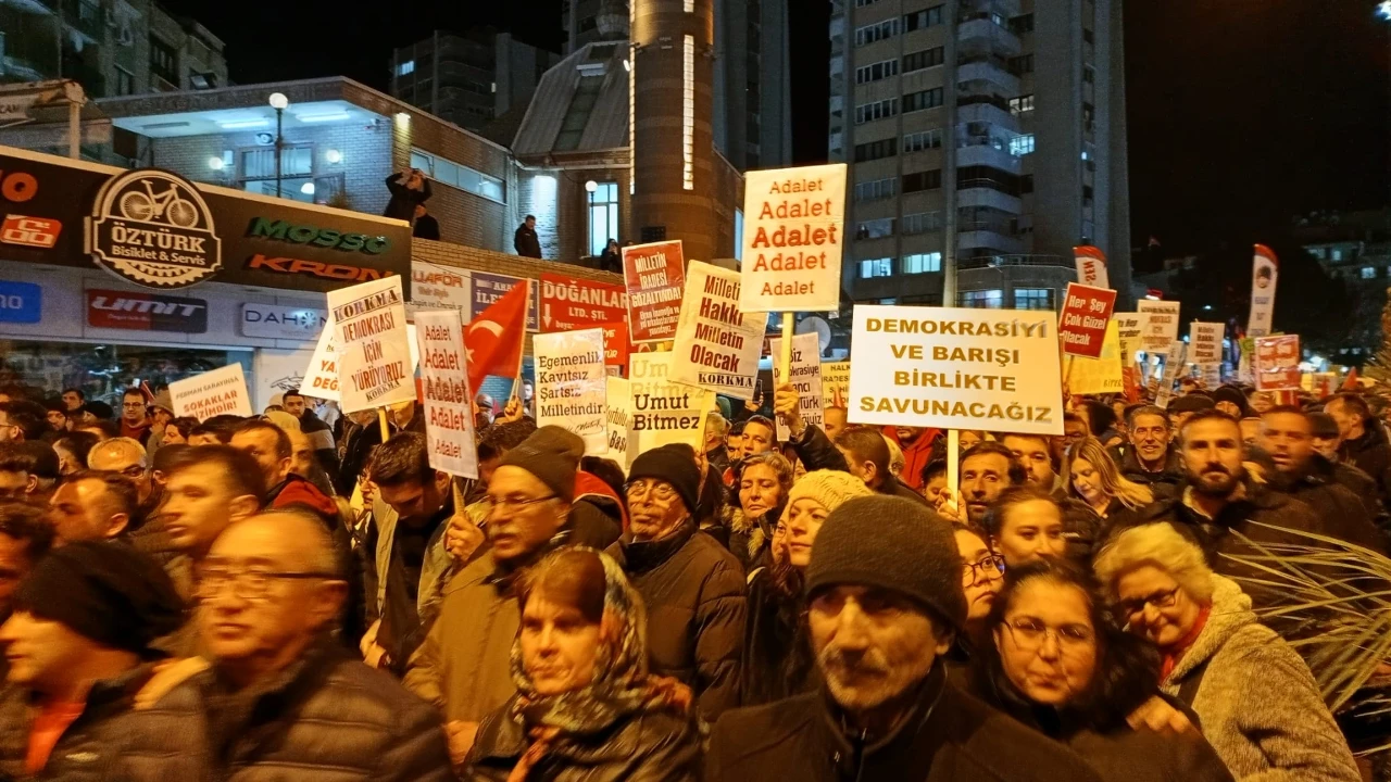 Manisa'da vatandaşlar, "Ekrem İmamoğlu yalnız değildir", "Adalet istiyoruz" gibi sloganlarla, hak, hukuk, adalet ve hükümet istifa sesleriyle tepki gösterdiler.