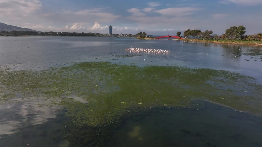 Balçova ilçesinde, flamingoların da aralarında bulunduğu birçok kuş türüne ev sahipliği yapan lagün yosun tabakası nedeniyle yeşile büründü.