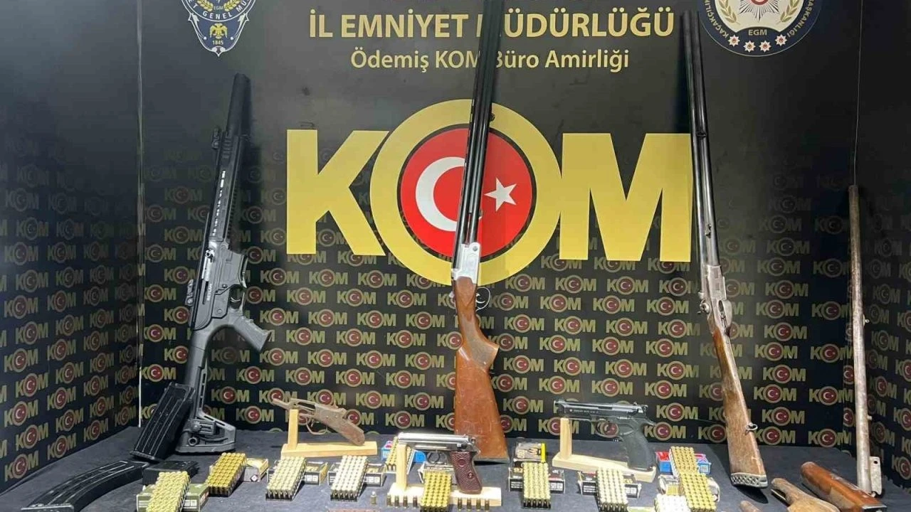 İl Emniyet Müdürlüğü Organize Suçlarla Mücadele Şube Müdürlüğüne bağlı Organize Suçlar Büro Amirliği ekiplerince Ödemiş ilçesinde yasadışı silah imalatı ve ticaretinin engellenmesine yönelik bir adrese operasyon yapıldı. Yapılan aramalarda; 1 adet ruhsatsız fabrikasyon tabanca, 1 adet üzerinde oynama yapılan kurusıkı tabanca, 1 adet ruhsatsız yivsiz otomatik av tüfeği, 3 adet ruhsatsız yivsiz av tüfeği, 7 adet şarjör, 562 adet fişek ve av tüfeği parçaları ele geçirildi. Olayla ilgili bir kişi gözaltına alındı. İşlemeleri için emniyete sevk edildi.