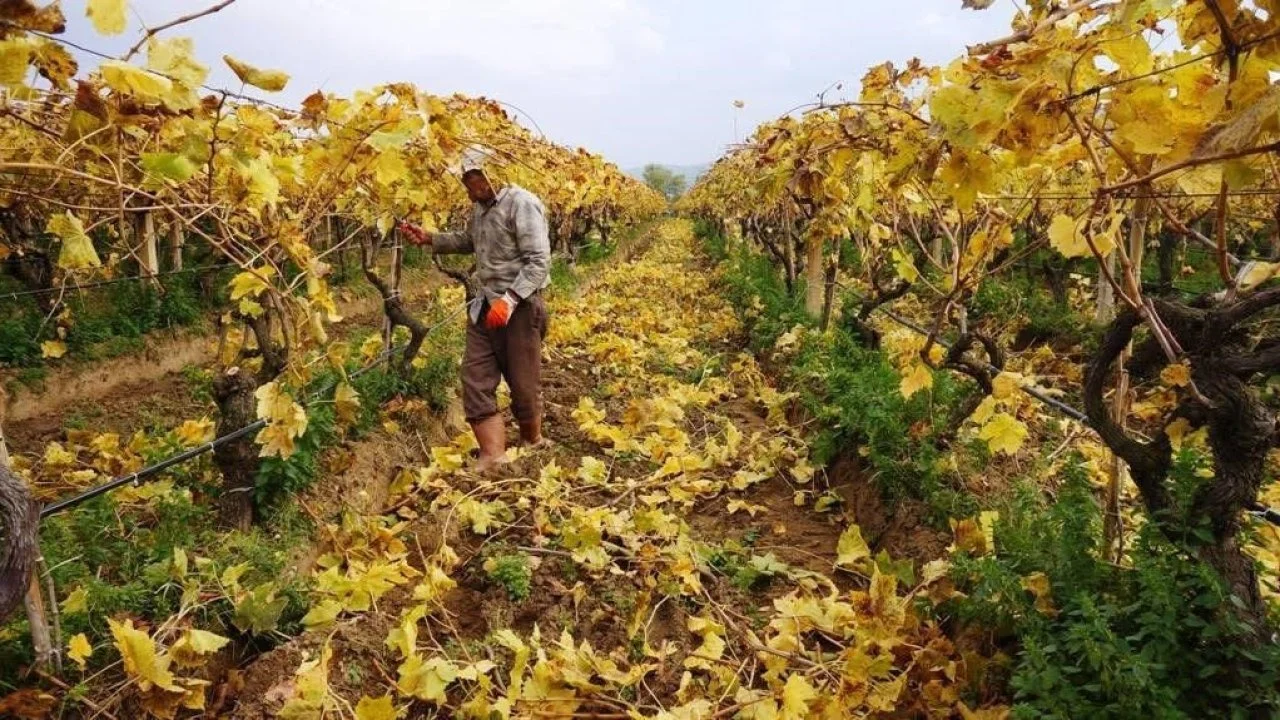 Manisa’nın Sarıgöl ilçesinde üzüm bağlarında sararan yapraklar, ortaya kartpostallık manzaralar çıkarırken, işçiler de hasadın tamamlandığı bağlarda doğal güzellik eşliğinde budama çalışmalarını sürdürüyor.