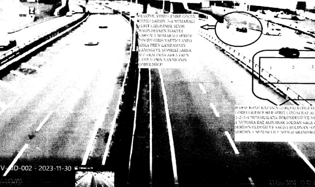 Görüntü inceleme tutanağında ayrıca, çarpışma anı sonrasında şüphelinin aracına ait arka fren lambalarının yanmadığı ve 3 numara ile adlandırılan şeride doğru seyir halinde olduğunun görüldüğü aktarıldı.