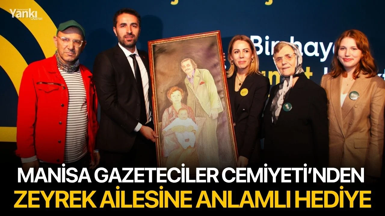 Ferdi Zeyrek Vakfı’nın açılış töreninde Manisa Gazeteciler Cemiyeti Başkanı Önder Aydın ve yönetim kurulu üyeleri, Zeyrek ailesine anlamlı bir hediye sundu. Merhum Başkan Zeyrek’in çocukluk fotoğrafı ile anne ve babasının yer aldığı tablo, eşi Nurcan Zeyrek ve kızı Nehir Zeyrek’e takdim edildi.