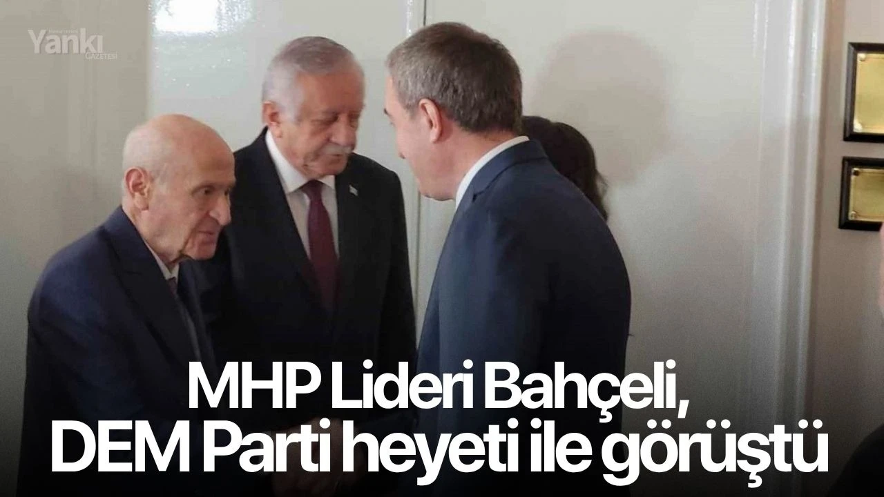 MHP Genel Başkanı Devlet Bahçeli, terör örgütü PKK’nın silah bırakma ve fesih kararının ardından DEM Parti Eş Genel Başkanları Tuncer Bakırhan ve Tülay Hatimoğulları ile görüştü. Bahçeli’ye görüşmede Meclis Başkanvekili Celal Adan ve Genel Başkan Yardımcısı Feti Yıldız eşlik ederken, DEM Parti heyetinde ise Grup Başkanvekilleri Sezai Temelli ve Gülistan Kılıç Koçyiğit de yer aldı. Bahçeli, Meclisteki makamında gerçekleşen görüşmede DEM Parti heyetini kapıda karşıladı. Basına kapalı gerçekleşen görüşme yaklaşık 40 dakika sürdü. Görüşmenin ardından Bahçeli, Bakırhan ve Hatimoğulları’nı yine kapıya çıkarak uğurladı.