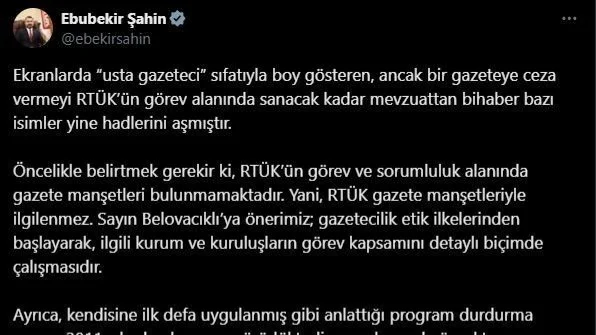 "Ekranlarda ’usta gazeteci’ sıfatıyla boy gösteren, ancak bir gazeteye ceza vermeyi RTÜK’ün görev alanında sanacak kadar mevzuattan bihaber bazı isimler yine hadlerini aşmıştır. Öncelikle belirtmek gerekir ki, RTÜK’ün görev ve sorumluluk alanında gazete manşetleri bulunmamaktadır. Yani, RTÜK gazete manşetleriyle ilgilenmez. Sayın Belovacıklı’ya önerimiz; gazetecilik etik ilkelerinden başlayarak, ilgili kurum ve kuruluşların görev kapsamını detaylı biçimde çalışmasıdır. Ayrıca, kendisine ilk defa uygulanmış gibi anlattığı program durdurma cezası, 2011 yılından bu yana yürürlüktedir ve çok sayıda örnekte uygulanmıştır. Kısacası bu, keyfi bir uygulama değil; 6112 sayılı Kanun’un 32. maddesi uyarınca uygulanan açık bir yasal düzenlemedir."