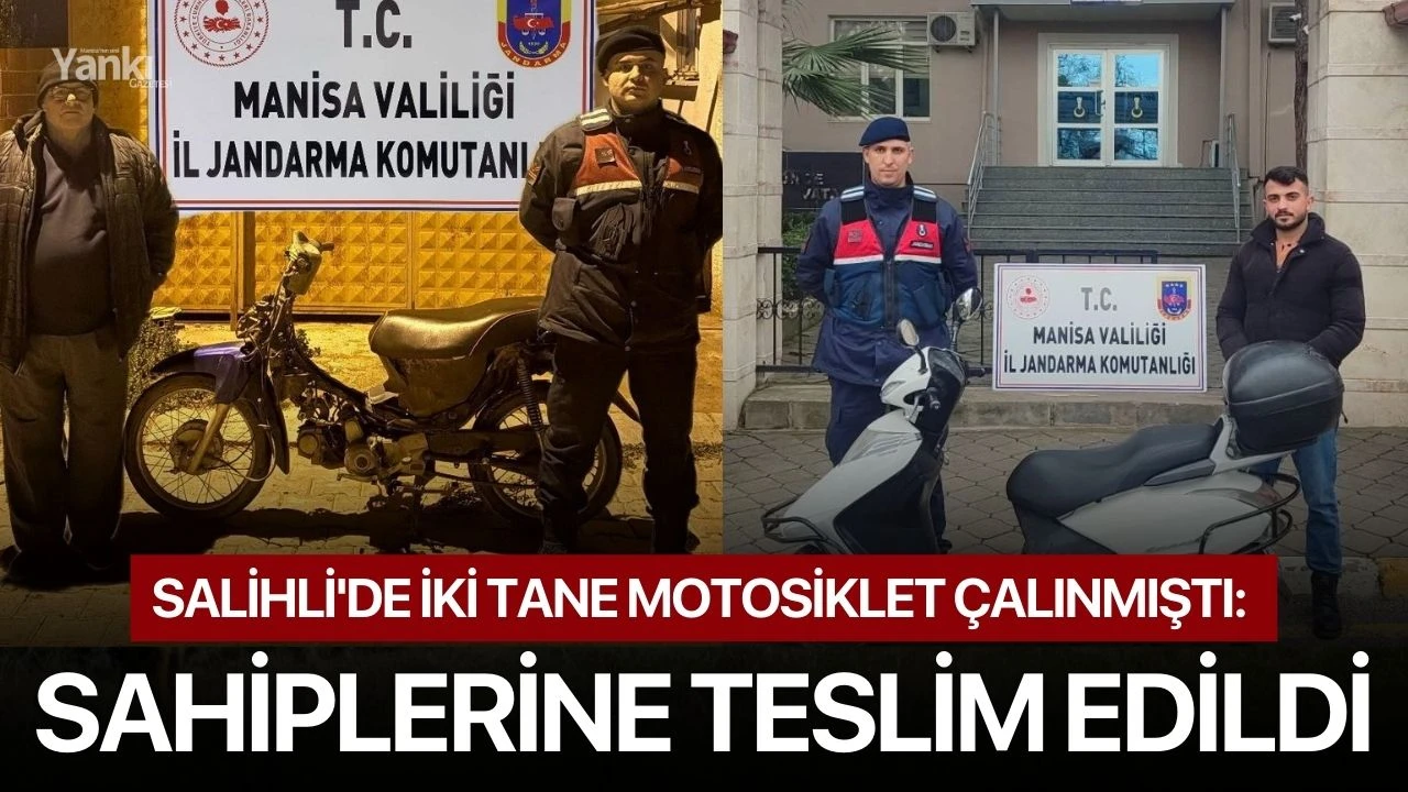 Manisa’nın Salihli ilçesine bağlı Hacıbektaşlı ve Durasıllı mahallelerinde hırsızlar tarafından çalınan 2 motosiklet, jandarma ekiplerinin çalışmaları sonucunda bulunarak sahiplerine teslim edildi.