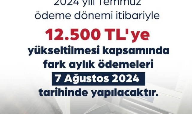 Bu çerçevede SGK'dan yapılan açıklamada "2024 Temmuz ödeme dönemi itibariyle en düşük emekli aylığı 12 bin 500 TL'ye yükseltildi. Fark aylık ödemelerinizi 7 Ağustos 2024 tarihinde hesabınızdan çekebilirsiniz" denildi.