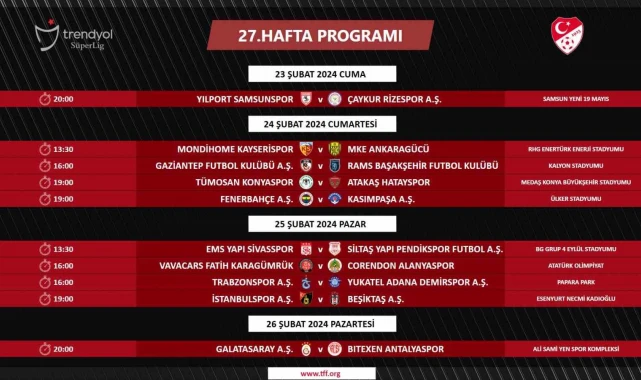 Trendyol Süper Lig'in 27, 28, 29 ve 30. haftalarında oynanacak maçların programı Türkiye Futbol Federasyonu (TFF) tarafından açıklandı. Ligin 28. haftasında Beşiktaş'ın, Galatasaray'ı ağırlayacağı mücadele 3 Mart Pazar günü saat 19.00'da yapılacak. Süper Lig'in 30. haftasında ise Trabzonspor ile Fenerbahçe 17 Mart Pazar günü saat 20.30'da karşı karşıya gelecek.