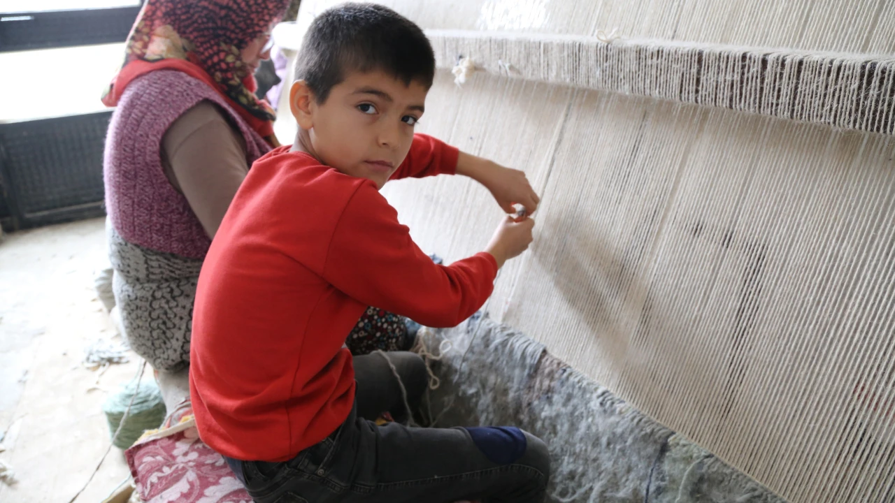 Gördes’in Güneşli Atatürk İlkokulu 3. sınıf öğrencisi Batuhan Demir, bir zamanlar halıcılığın merkezi olan Gördes’te tatillerde annesiyle beraber halı dokuyor.
