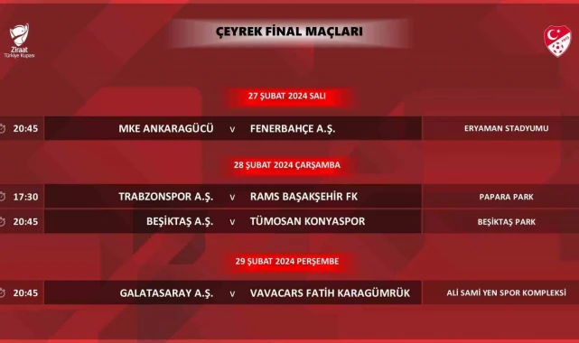 Ziraat Türkiye Kupası çeyrek final maçlarının programı, Türkiye Futbol Federasyonu (TFF) tarafından duyuruldu. 27, 28 ve 29 Şubat tarihlerinde oynanacak çeyrek final mücadelelerinin programı şöyle: